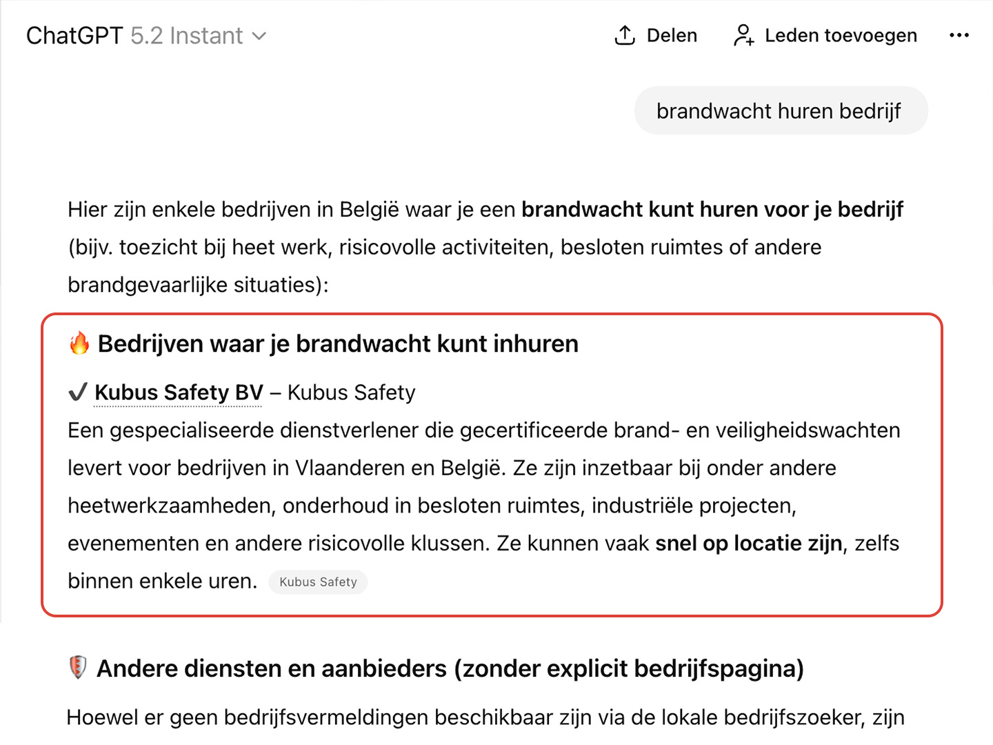 Dankzij de uitgebreide website en de consistente SEO-aanpak wordt Kubus Safety ook actief vermeld in AI-zoekmachines zoals ChatGPT. Zo vergroot de zichtbaarheid verder, ook buiten de klassieke zoekresultaten.