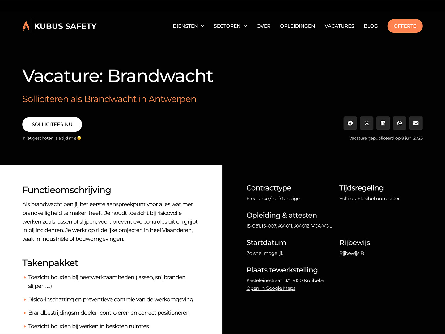 Kubus Safety is een veiligheidsbedrijf gespecialiseerd in brandveiligheid en het verhuren van brand- en veiligheidswachten. Het bedrijf werd opgestart in 2025 en had bij de lancering nog geen online zichtbaarheid. We bouwden een uitgebreide website die zich al binnen één week na livegang volledig terugverdiende met de eerste aanvraag.