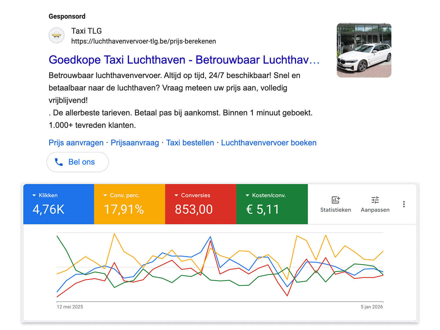 Sinds april 2025 beheren we de Google Ads-campagnes voor Taxi TLG. Dankzij continue optimalisatie en het sterke offerteformulier behalen we een gemiddelde kost per conversie van €5,11 en een conversieratio van 17,91%.